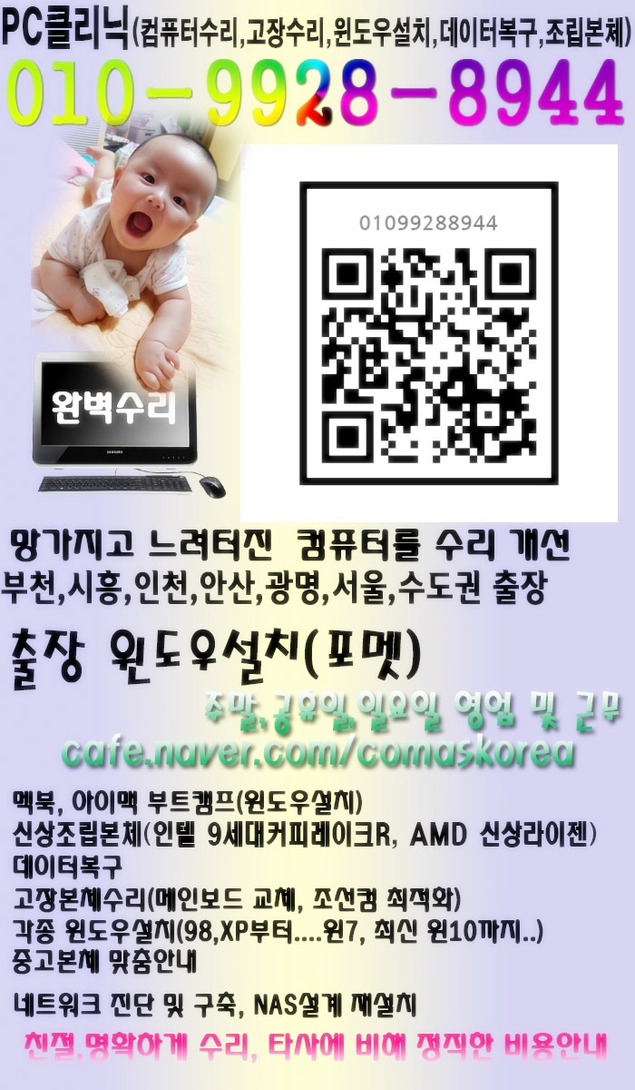 컴퓨터수리 출장기사 010-9928-8944 친정컴(친절하고 정직한 출장AS기사 모임카페) 서울,경기,인천, 수도권 전지역 출장 가능. 포맷(포멧),윈도우설치,운영체제설치,조립PC제작,판매,정비,수리,AS,서
