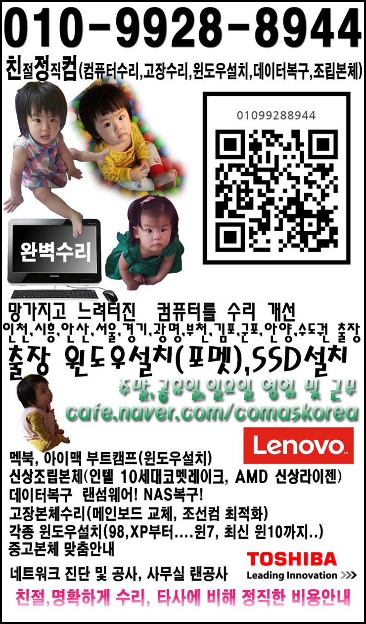 친절정직한출장컴퓨터수리기사입니다. 수도권 서울경기인천 전지역 출장 가능합니다. 010-9928-8944 레노버,도시바 서울강서센터 정식협력...